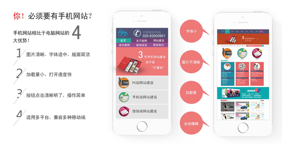 手機網站時代迅猛來襲OUT了?截至2014年底,手機網民數達:6.3億網站流量有33%來自移動互聯網并持續上升中56%的移動互聯網網民每天上網1小時以上78%每天至少手機上網1次以上4G時代已經來臨,智能大屏手機的發展,手機網站應運而生,發展迅猛。如果你現在還沒有手機網站,你已經遠遠落后于競爭對手了